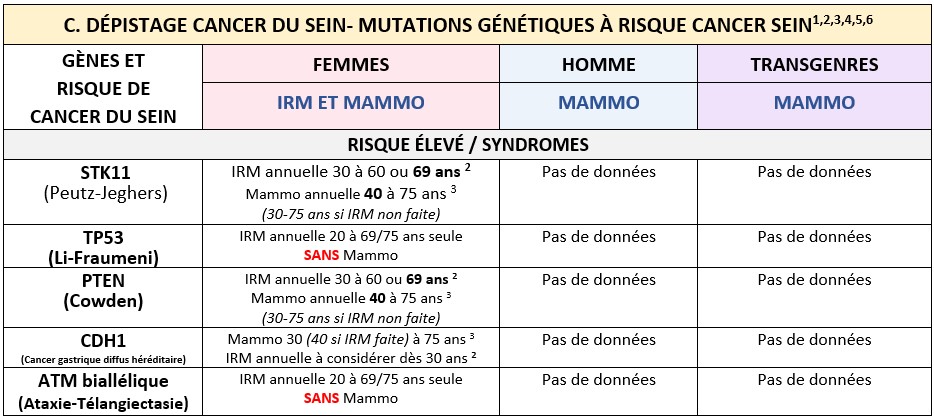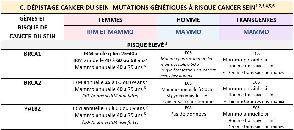 NOTE : Les femmes ayant eu une mastectomie totale avec ou sans reconstruction n’ont pas besoin de mammographie ni d’IRM de dépistage du ou des côtés opérés.
